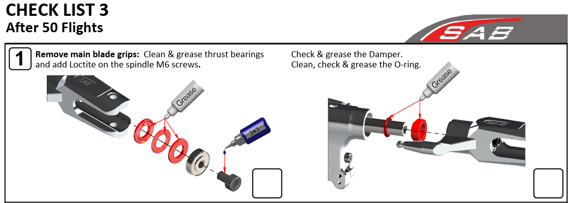 SAB ist bekannt für ihre ausführlichen und gut bebilderten Aufbauanleitungen. Aber in den Tiefen des Systems finden wir auch viele weitere Hinweise mit Detailinfos zu einzelnen Bauabschnitten. Des Weiteren hat sich SAB Gedanken gemacht über die Langlebigkeit ihrer Helis und asuführliche Checklisten bereitgestellt.
